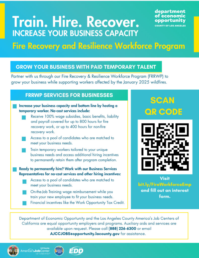 Businesses can increase capacity by hosting temporary workers through the Fire Recovery & Resilience Workforce Program. The program covers wages, benefits, liability, and payroll, and also offers incentives for permanent hires.